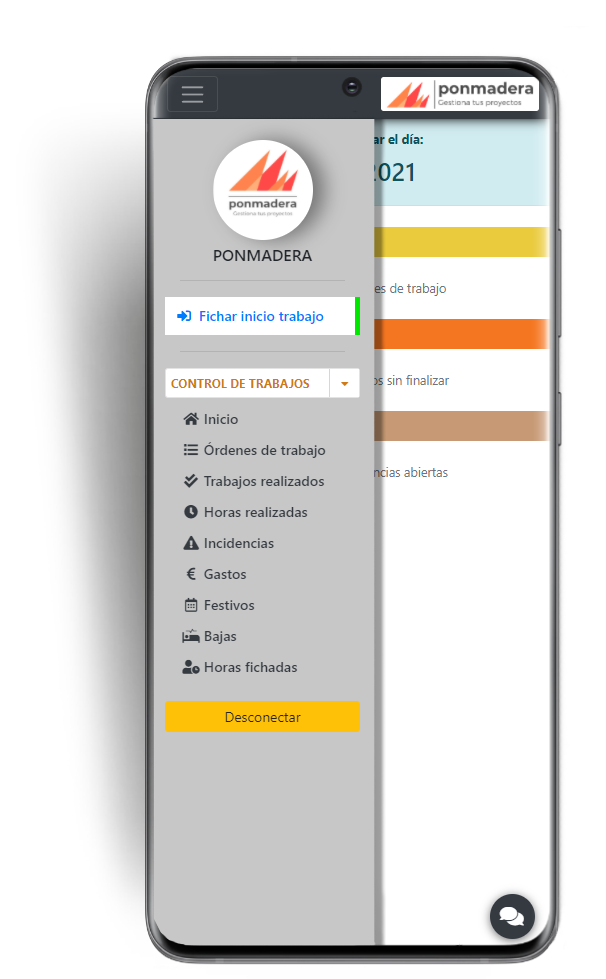 Añade o consulta tus horas realizadas diariamente en cada trabajo. Puedes gestionar incidencias que se hayan producido en algún trabajo, pudiendo añadir fotografías directamente desde el teléfono.